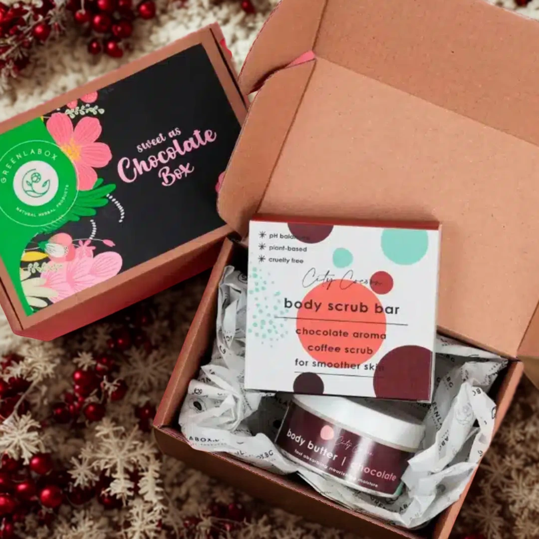 Изненадай любим човек с тази неустоимо сладка шоколадова кутия. Съчетахме за вас натурален скраб бар с кафе и пухкаво масло за тяло, които ще оставят кожата съвършено гладка и подхранена, а емоциите ще бъдат приповдигнати от шоколадово ухание.